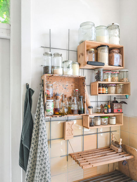 This setup allows easy access to food jars and essentials while avoiding the heavy look of full cabinets.
